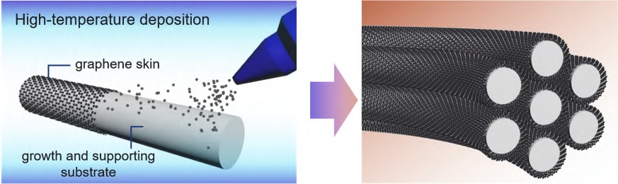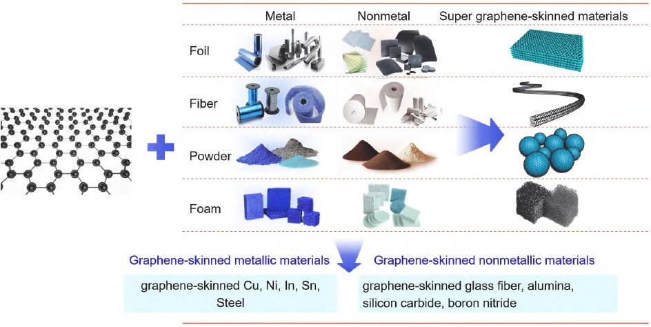 通過高溫生長過程和巧妙的工藝設計,在傳統材料表面沉積連續態石墨烯薄膜。借助高性能石墨烯“蒙皮”,賦予傳統材料全新的功能,讓原子級厚度的石墨烯薄膜搭乘傳統材料載體走進市場。
