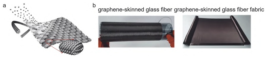 (a)纖維絲束和織物上石墨烯CVD生長示意圖;(b)蒙烯玻璃纖維絲束(左)和蒙烯玻璃纖維織物(右)的實物照片