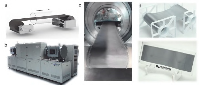 此外,利用玻璃纖維織物輕質、柔性、高強度的特點,BGI團隊設計了動態“卷對卷”規;疌VD生長系統,并對氣體流場、生長區熱場、溫度控制系統、進料控制系統等關鍵模塊進行了系統集成,研制 出第一代蒙烯玻璃纖維織物規;苽溲b備。