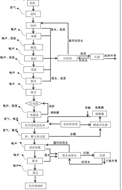 項目總投資5000萬,主要建設內容為新建1條年產70萬噸石英砂水洗生產線,1條年產30萬噸光伏玻璃砂酸洗生產線。