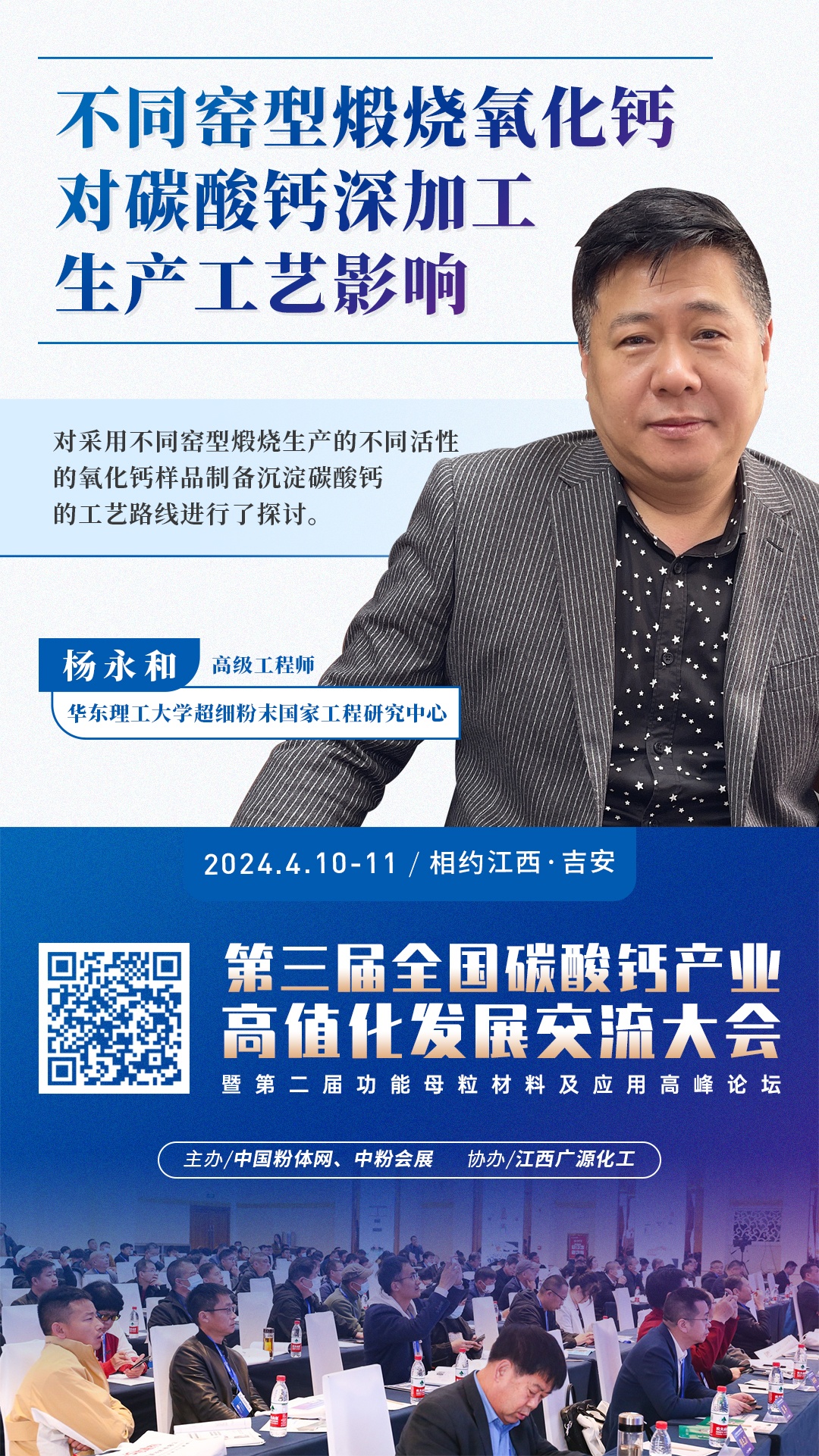 2024年4月10日~11日,第三屆全國碳酸鈣產業(yè)高值化發(fā)展交流大會將在江西·吉安舉行,屆時華東理工大學超細粉末國家工程研究中心高級工程師楊永和將在大會上作《不同窯型煅燒氧化鈣對碳酸鈣深加工生產工藝影響》主題報告,對采用不同窯型煅燒生產的不同活性的氧化鈣樣品制備沉淀碳酸鈣的工藝路線進行探討,研究匯報氧化鈣活性對普通輕質碳酸鈣和納米碳酸鈣生產以及應用的影響。