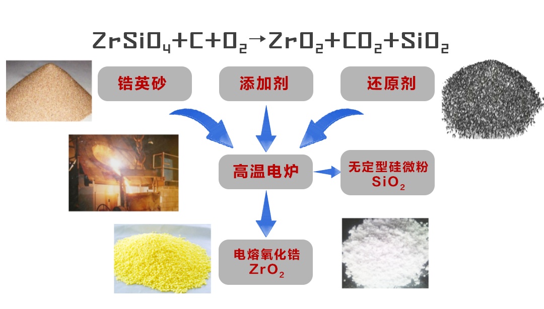 電熔氧化鋯是借助鋯英砂碳化還原除硅的原理,通過控制碳量和催化劑量使硅在高溫下從鋯英砂中分離出來,其生產(chǎn)主要包括兩個(gè)工序:電弧爐熔煉脫硅工序和產(chǎn)品的后處理加工工序。