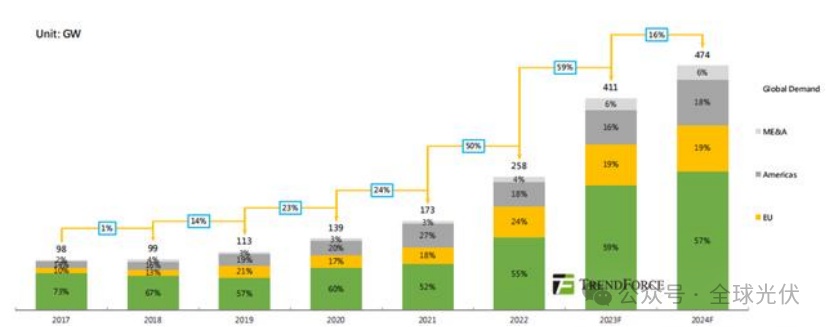 談到明年新增裝機(jī)時(shí),TrendForce集邦咨詢預(yù)計(jì),2024年全球光伏新增裝機(jī)量的中性預(yù)期為474GW,同比增長(zhǎng)16%,與2023年59%的增速相比,增幅明顯大幅放緩。