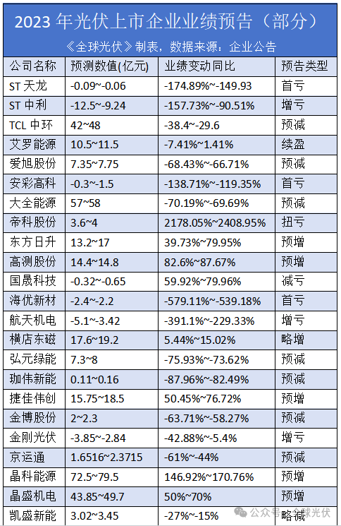 光伏上市公司業(yè)績(jī)預(yù)告陸續(xù)出爐。據(jù)不完全統(tǒng)計(jì),截止到2024年,已有43家企業(yè)發(fā)布業(yè)績(jī)預(yù)告,其中兩極分化頗為嚴(yán)重,不同產(chǎn)業(yè)鏈悲歡不盡相同。以天合光能、晶科能源、東方日升、橫店東磁為代表的組件企業(yè)繼續(xù)保持盈利狀態(tài),其中協(xié)鑫集成最為突出,預(yù)增152.87%~270.88%;逆變器企業(yè)陽光電源、上能電氣預(yù)增均達(dá)170%以上;微導(dǎo)納米、快可電子、通靈股份等裝備輔材廠家也實(shí)現(xiàn)50%以上的增長(zhǎng)。