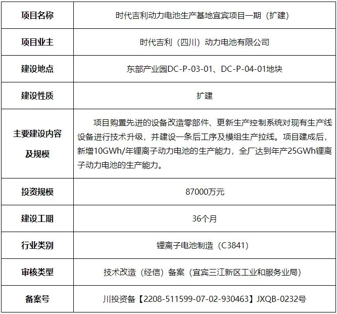 近日,四川經信廳發布關于時代吉利(四川)動力電池有限公司時代吉利動力電池生產基地宜賓項目一期(擴建)的節能審查意見。四川經信委原則同意該項目節能報告。