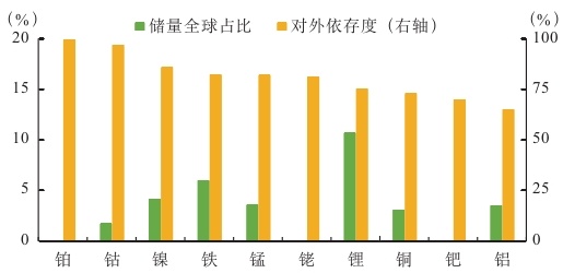 我國部分關鍵金屬礦產儲量全球占比與對外依存度