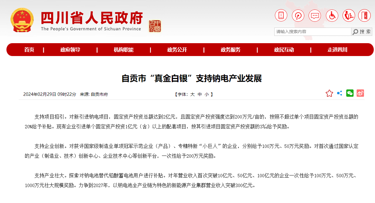 中國粉體網訊 2月29日,四川省人民政府網站發布自貢市支持鈉電發展的消息。