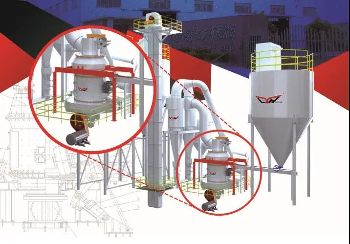 大塊狀物料經顎式破碎機破碎到所需粒度后,由提升機將物料送至儲料斗,再經皮帶秤將物料精確均勻地送入主機磨室內進行研磨。粉磨后的粉子隨風機氣流上升,經選粉機進行分級,符合細度的粉子隨氣流經管道進入旋風收集器內,進行分離收集,經出粉閥排出即為成品粉子。氣流由旋風集粉器上端回風管吸入離心引風機,一部分進入氣箱脈沖收塵器,由于收塵風機的作用使整個氣流系統在負壓狀態下循環工作。