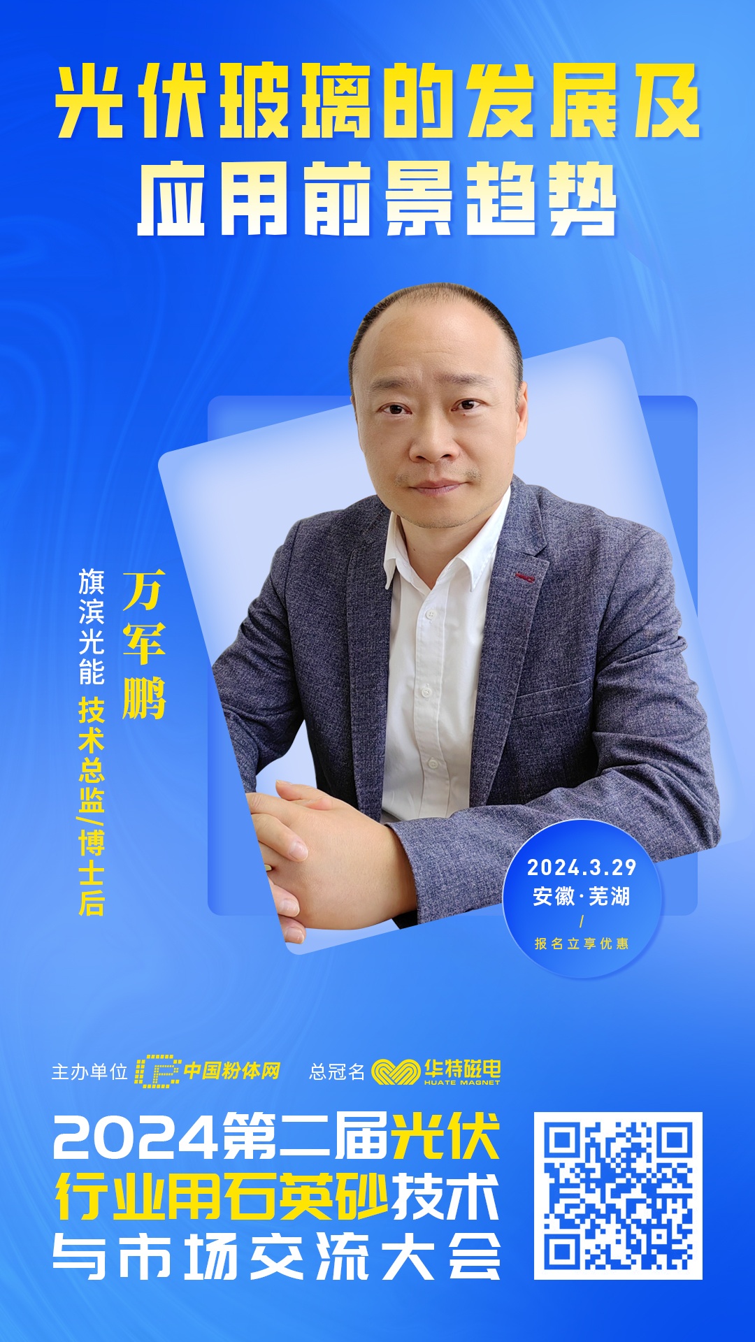 旗濱光能隸屬于旗濱集團(tuán),依托母公司產(chǎn)業(yè)鏈優(yōu)勢(shì),已成為國(guó)內(nèi)優(yōu)質(zhì)的光伏玻璃企業(yè)之一。2024年3月29日,由中國(guó)粉體網(wǎng)主辦的“2024第二屆光伏行業(yè)用石英砂技術(shù)與市場(chǎng)交流大會(huì)”將在安徽蕪湖召開(kāi),旗濱光能技術(shù)總監(jiān)萬(wàn)軍鵬將做《光伏玻璃的發(fā)展及應(yīng)用前景趨勢(shì)》的報(bào)告,屆時(shí),萬(wàn)總將介紹旗濱光能的先進(jìn)發(fā)展經(jīng)驗(yàn)并全面分析光伏玻璃的市場(chǎng)發(fā)展情況,敬請(qǐng)期待!
