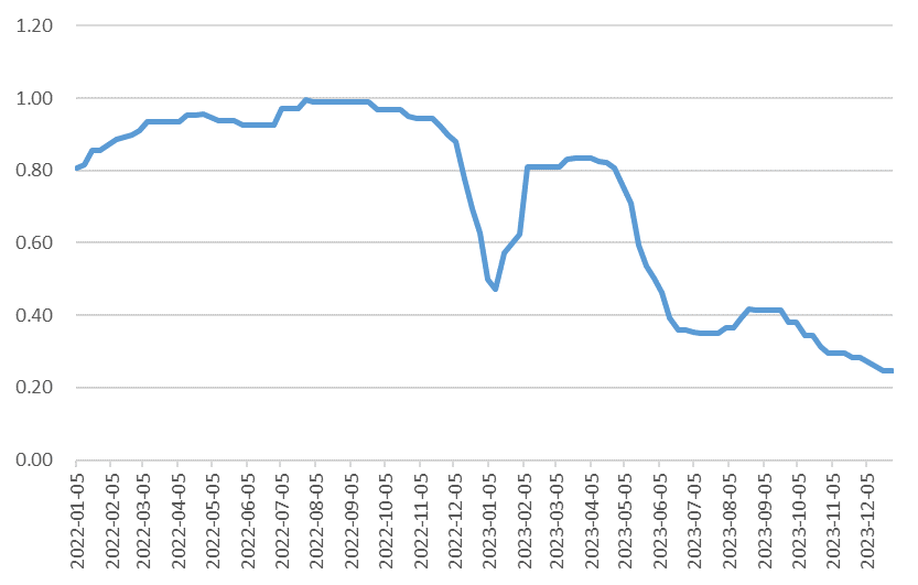 2022年-2023年中國單晶硅片(182mm/165μm)現(xiàn)貨價(jià)格(平均價(jià))走勢(shì)圖(單位:美元/片)
