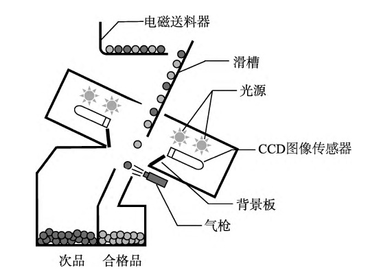 色選技術是根據物料光學特性的差異,利用光電探測技術將顆粒狀物料中的異色顆粒物料自動分揀出來。較純的硅石為白色或乳白色,含鐵雜質或其脈石礦物的顏色則呈微黃、淺黃色或淺褐色和灰色等,在顏色和光澤上存在一定的差異,理論上可以利用這種差異將它們分離。