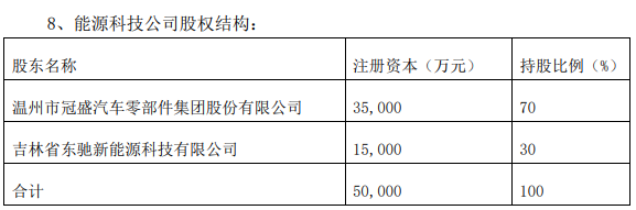 合資公司架構:溫州市冠盛汽車零部件集團股份有限公司(冠盛股份)與吉林省東馳新能源科技有限公司(吉林東馳)于 2023年12月簽訂《戰略合作協議書》,并于2024年1月3日發布公告進行披露,公告中提及,冠盛股份擬投入建設運營資金,以貨幣出資,占股70%;東馳新能源投入核心技術,以無形資產評估作價出資,擬占股30%。