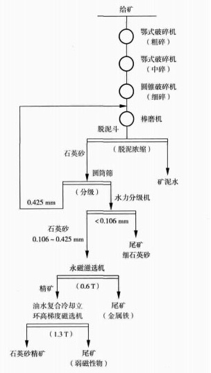 濕法選礦主要通過機械擦洗配合磁選、浮選、酸浸等工藝,對石英巖原礦中的雜質(zhì),特別是鐵質(zhì)雜質(zhì)進行去除。一般工藝流程為:原礦進行破碎→磨礦→加水沖洗→磁選→水力分級→石英精砂。