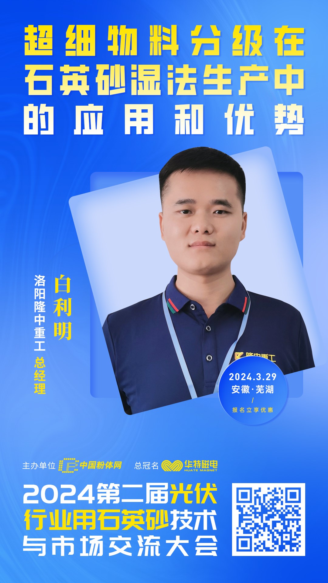 2024年3月29日,中國粉體網(wǎng)將于安徽·蕪湖悅園方酒店舉辦“第二屆光伏行業(yè)用石英砂技術與市場交流大會”。來自洛陽隆中重工的總經(jīng)理白利明將作《超細物料分級在石英砂濕法生產(chǎn)中的應用和優(yōu)勢》報告。
