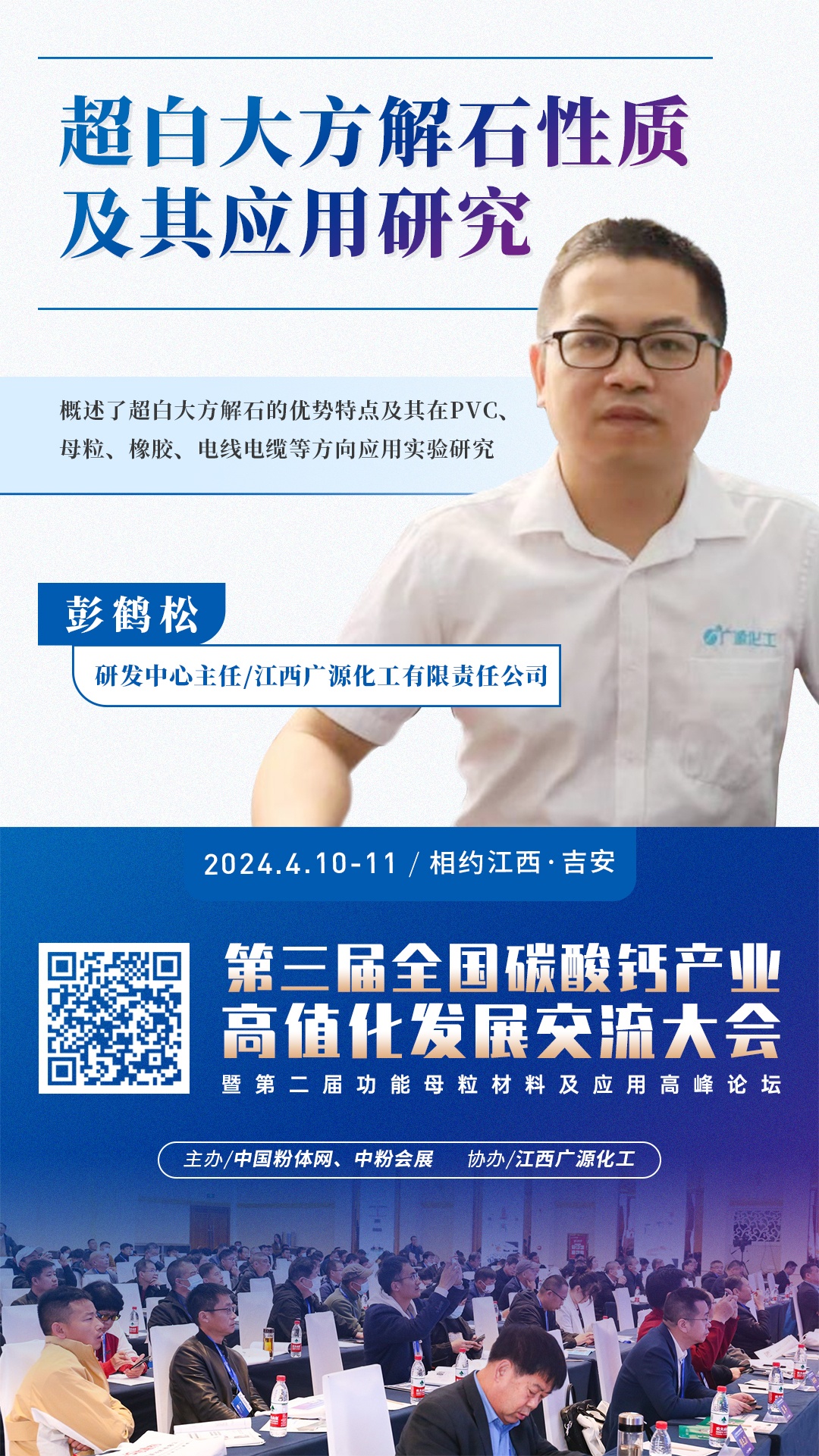 2024年4月10日~11日,第三屆全國碳酸鈣產業高值化發展交流大會將在江西·吉安舉行,屆時江西廣源化工有限責任公司研發中心彭鶴松主任將在大會上作《超白大方解石性質及其應用研究》主題報告,概述超白大方解石的優勢特點,以實驗案例講解其在PVC母粒、橡膠、電線電纜等方向應用優勢和價值。