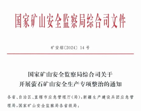 為切實解決螢石礦山安全生產(chǎn)突出問題,有效防控重大安全風(fēng)險,動態(tài)清零重大事故隱患,堅決遏制重特大事故,穩(wěn)步推動礦山本質(zhì)安全水平提升,國家礦山安全監(jiān)察局決定在全國范圍內(nèi)開展螢石礦山安全生產(chǎn)專項整治(時間為2024年3月至8月)。