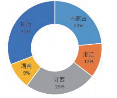 中國螢石礦產(chǎn)資源分布不均,主要集中在浙江、湖南、江西、內(nèi)蒙古4個省份(自治區(qū))。大中型螢石礦床主要分布在東部沿海地區(qū)、華中地區(qū)的湖南、湖北、河南3省和內(nèi)蒙古中東部,貴州、云南等西部地區(qū)較少。