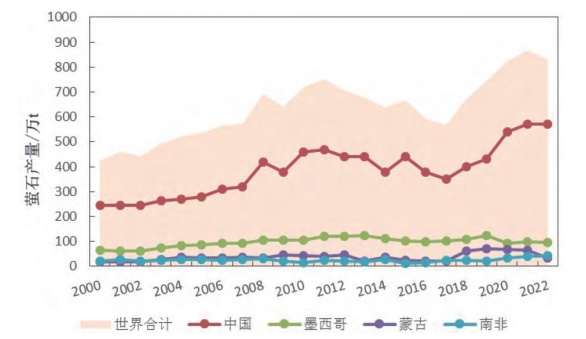 2000—2022年主要螢石生產(chǎn)國產(chǎn)量變化圖
