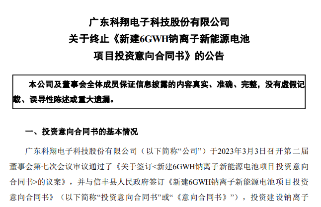 據悉,2023年3月,科翔股份與信豐縣人民政府簽訂《新建6GWH鈉離子新能源電池項目投資意向合同書》,投資建設鈉離子電池及材料新能源工業園,項目主要是鈉離子電池及材料的研發、生產及銷售,總投資20億元。2023年9月,因其他投資項目,原計劃在信豐縣建設的項目不再繼續開展。今年2月,科翔股份因前述項目進展披露不及時,被廣東證監局出具警示函,并收到交易所監管函。