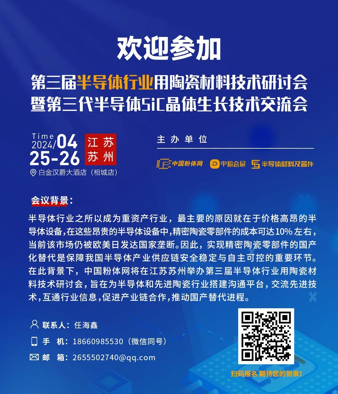 第三屆半導體行業用陶瓷材料技術研討會將于 2024年4月25-26日在蘇州舉辦。無錫村田電子有限公司邀請您共同出席。