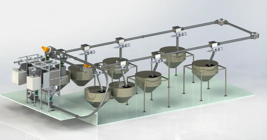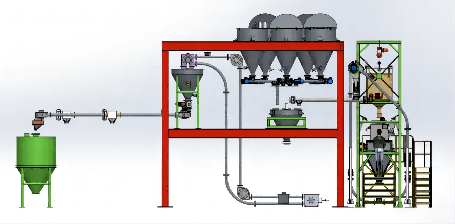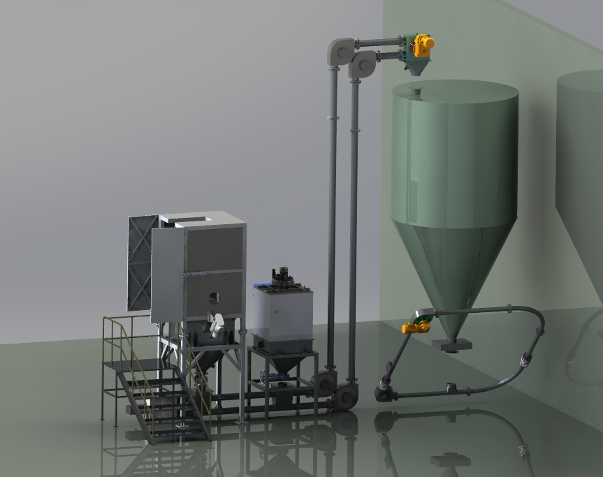 物料卸料后,通過管鏈輸送或氣力輸送等方式輸送到料倉進行固氣分離,物料進入料倉,帶有粉塵的氣體經過除塵器過濾后排入大氣。