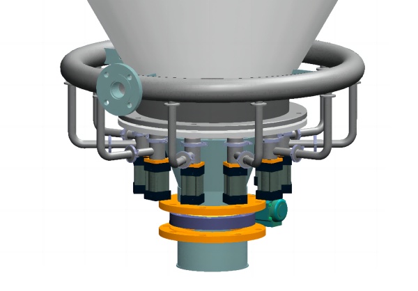 在混合機底部蓄壓的空氣瞬間噴射時,罐頭內的粉粒體就變成沸騰狀態,開始充分攪拌混合。噴入的空氣由上方的空氣過濾器排出。噴射很短的時間和消耗很少的壓縮空氣,就能夠充分混合和高效勻質。結合原料輸送,引入觸摸屏和PLC控制,可以很方便組建原料自動處理生產線。