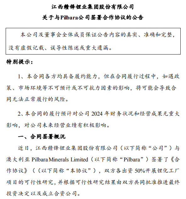 中國(guó)粉體網(wǎng)訊 3月26日,贛鋒鋰業(yè)發(fā)布公告稱(chēng),近日,公司與澳大利亞Pilbara Minerals Limited(以下簡(jiǎn)稱(chēng)“Pilbara”)簽署了《合作協(xié)議》,雙方各出資50%開(kāi)展鋰化工廠(chǎng)項(xiàng)目的可行性研究,并根據(jù)可行性研究結(jié)果由雙方共同批準(zhǔn)推進(jìn)最終投資決定以及成立合資公司。