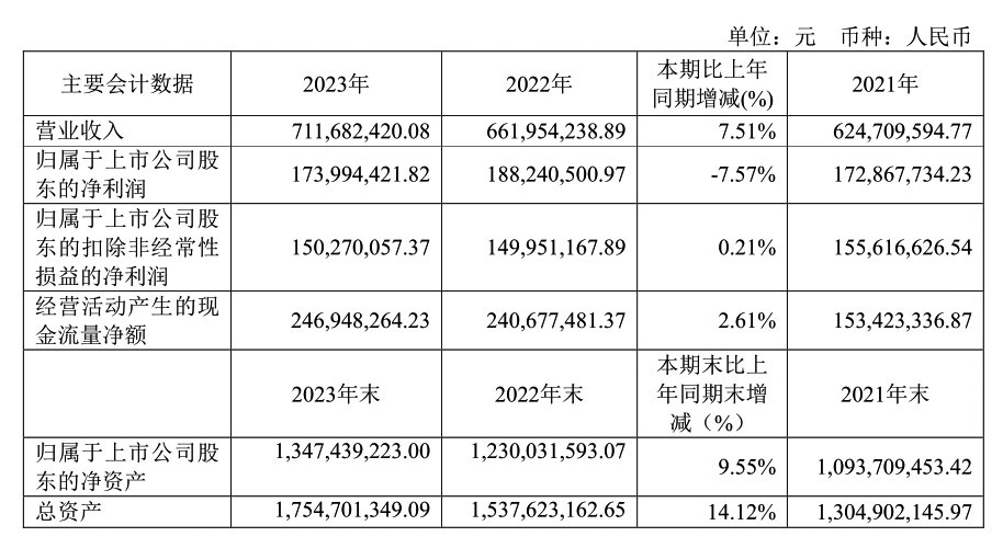 中國粉體網訊 3月25日,聯瑞新材發布年度業績報告稱,2023年營業收入約7.12億元,同比增加7.51%;歸屬于上市公司股東的凈利潤約1.74億元,同比減少7.57%。