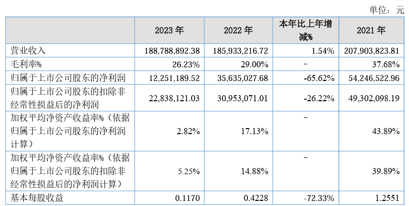 中國粉體網訊 3月26日,天馬新材發布2023年年報,報告期間,公司實現營業總收入1.89億元,同比增長1.54%,歸母凈利潤1225.12萬元,同比下降65.62%。
