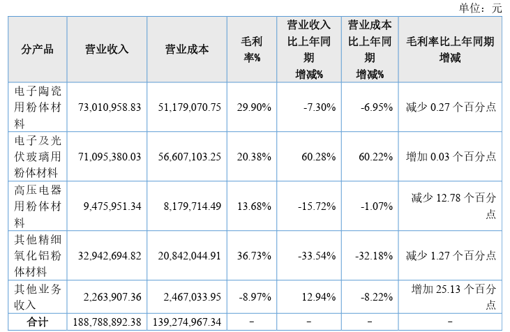 緊抓液晶基板玻璃發展戰略機遇期,配合下游主要客戶擴產需求,同時覆蓋新領域新客戶,電子玻璃類粉體全年銷售收入較上年同期增長60.28%。