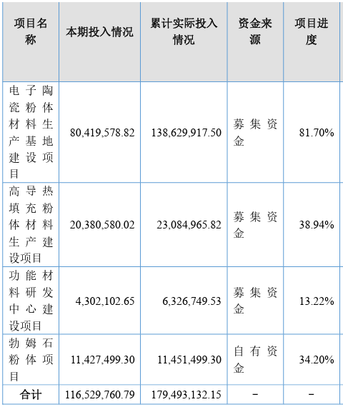 項目建設持續推進,報告期內,年產5萬噸電子陶瓷生產線一期工程已按期點火試生產,產出成品各項指標超越可研目標,為后續二期、三期工程的順利投產奠定了堅實的基礎,是產品邁向高質量發展的重要標志。年產5千噸高導熱球形氧化鋁生產線和年產5千噸勃姆石生產線如期推進中。隨著產業規模擴大和生產效率的提升,成本競爭力將得到進一步提升。