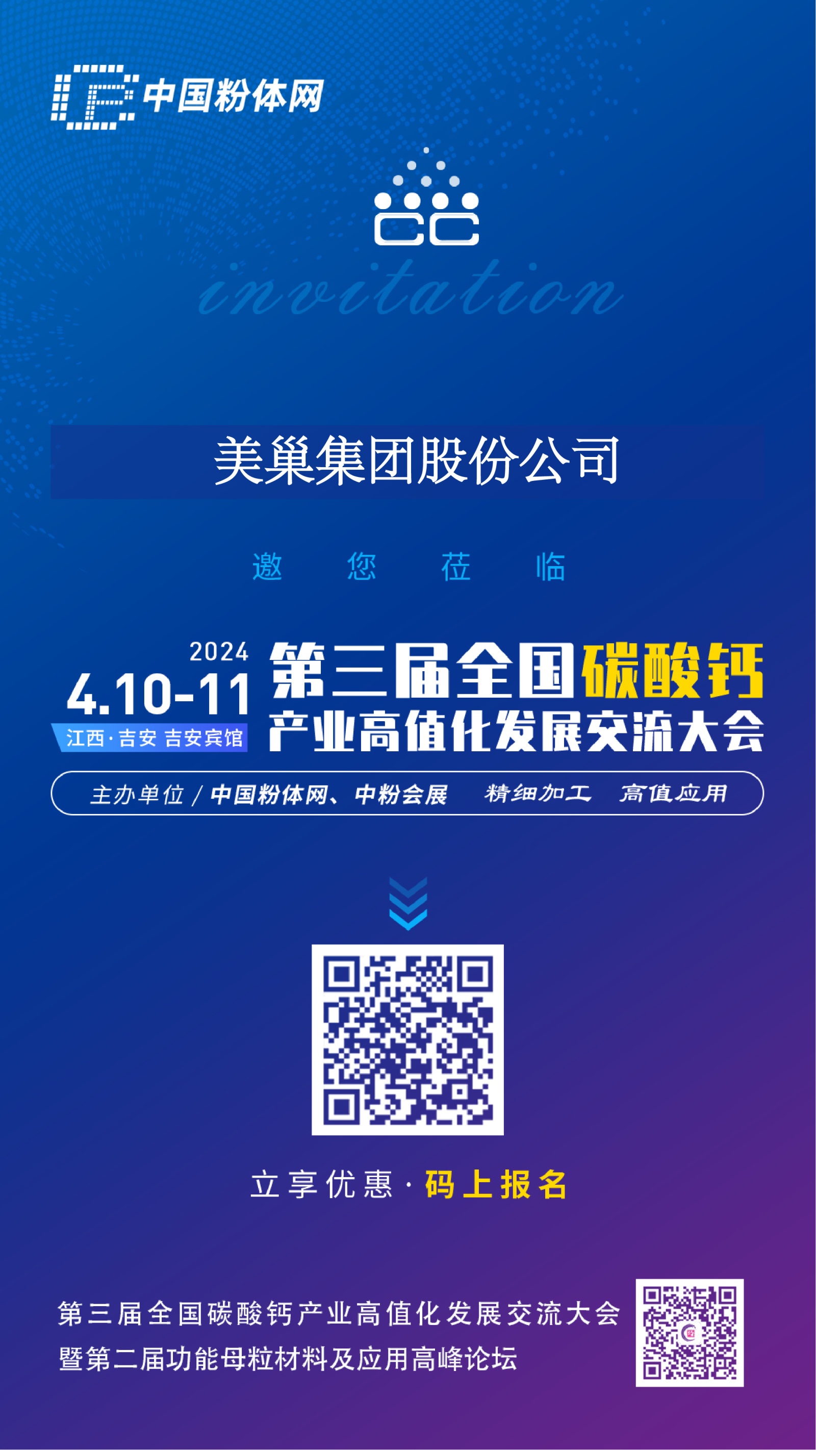 由中國粉體網主辦的“2024第三屆全國碳酸鈣交流會”將于2024年4月10-11號在江西吉安舉辦,美巢集團股份公司邀您一同參加。