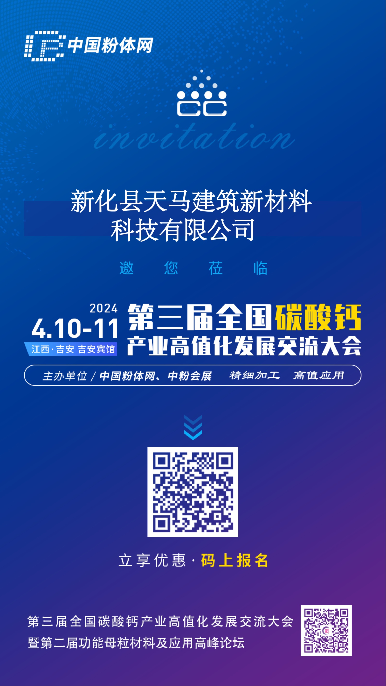 由中國(guó)粉體網(wǎng)主辦的“2024第三屆全國(guó)碳酸鈣交流會(huì)”將于2024年4月10-11號(hào)在江西吉安舉辦,新化縣天馬建筑新材料科技有限公司邀您一同參加。