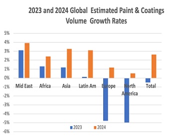 2023年和2024年全球預(yù)計油漆和涂料產(chǎn)量增長率