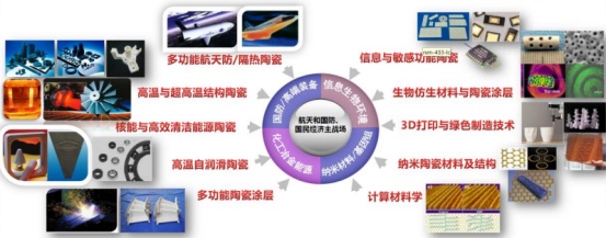 特陶所現有研究室包括多功能航天防/隔熱陶瓷室、高溫與超高溫結構陶瓷室、核能與高效清潔能源陶瓷室、高溫自潤滑陶瓷室、多功能陶瓷涂層室、多鐵性陶瓷材料與器件室等。研究方向由最初的先進陶瓷相變與韌化機理,拓展到多功能防熱陶瓷基復合材料、非晶及納米等亞穩態材料、先進結構陶瓷及復合材料、高溫與超高溫陶瓷、特種功能陶瓷涂層與表面改性、信息功能陶瓷與薄膜、生物陶瓷材料與涂層等方向。部分重點研究領域介紹如下: