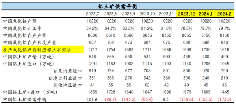 而國內鋁土礦供應偏緊,據SMM數據顯示,2023年中國鋁土礦產量6552萬噸,累計同比-3.4%,下半年產量環比呈現逐月下滑的趨勢。據百川盈孚數據顯示,2023年12月國產鋁土礦開工率環比-4.87至49.42%,國產鋁土礦產量嚴重下滑。