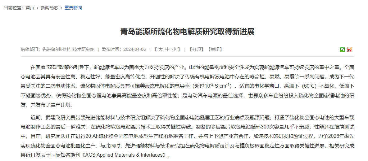 中國粉體網訊  自4月9日廣汽埃安旗下昊鉑品牌宣布將于4月12日發布“昊鉑全固態電池”后,4月10日,中國科學院青島生物能源與過程研究所(簡稱:中科院青島能源所)也發布消息,稱研究所先進儲能材料與技術研究組在硫化物電解質研究取得新進展,解決了硫化物全固態電池疊層工藝的行業痛點及瓶頸問題,打通了硫化物全固態電池的大型車載電池制作工藝的最后一道難關,在硫化物軟包電池疊片技術上取得關鍵性突破。