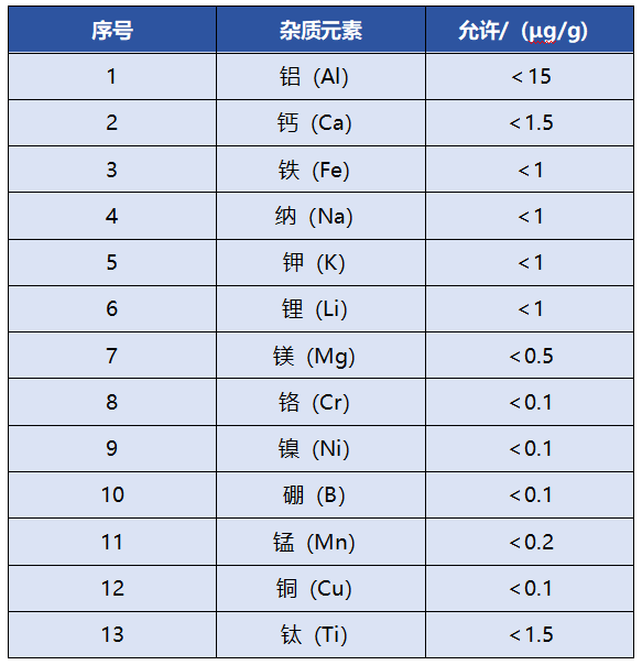 雜質元素含量:高純石英砂雜質元素總含量應≤20 μg/g,其中鉀、鋰、鈉含量總和<2.5 μg/g,各雜質元素含量應符合表2的規定。