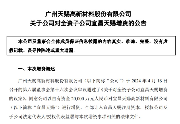 中國粉體網訊 天賜材料4月17日晚間公告,公司擬以2億元對全資子公司宜昌天賜高新材料有限公司(簡稱“宜昌天賜”)進行增資。