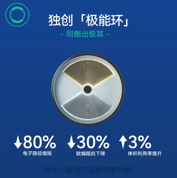 極能環:傳統 4680圓柱電芯正負極采用異側設計,電子傳輸路徑過長,內阻偏大。正力新能獨創同側出極耳技術,可大幅度縮短電子傳輸路徑,降低歐姆電阻。相較于全極耳技術,同側出極耳設計可以將大圓柱電芯電子路徑縮短80%、歐姆阻抗下降 30%,體積利用率提升3%。