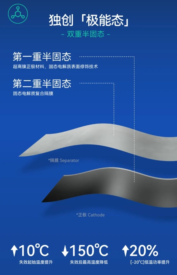 極能態:即雙重半固態電芯技術。正力新能研發了超高鎳正極材料的固態電解質表面修飾技術和固態電解質復合隔膜技術。得益于此,大圓柱電芯的失效起始溫度提升10℃,失效最高溫度降低150℃。功率性能改善上,零下20℃ 低溫功率提升了20%。