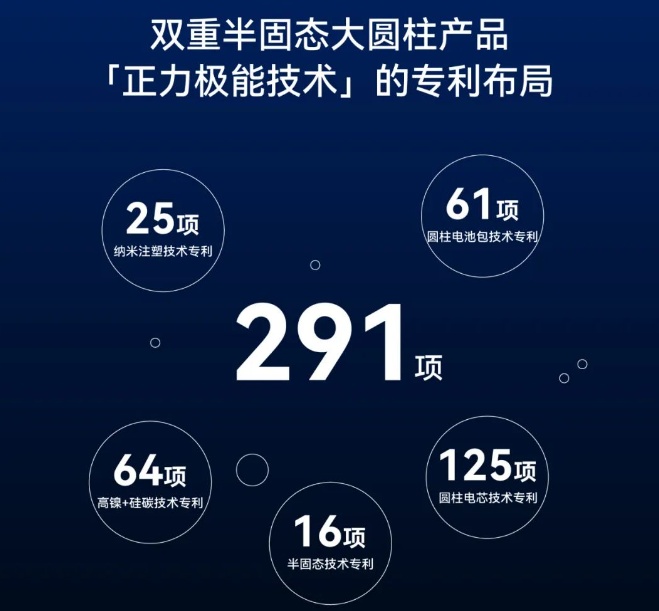 專利方面,截至目前,正力極能電芯技術已經擁有 291 項專利布局,其中納米注塑25項、高鎳+硅碳 64 項、半固態技術 16 項、圓柱電芯技術 125 項、圓柱電池包技術 61 項。