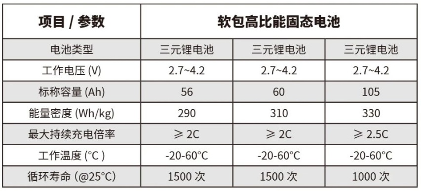 太藍新能源軟包高比能固態電池類型為三元鋰電池,最高標準容量為105Ah,最高能量密度可達330Wh/kg,已經具備了2.5C的充電倍率性能。