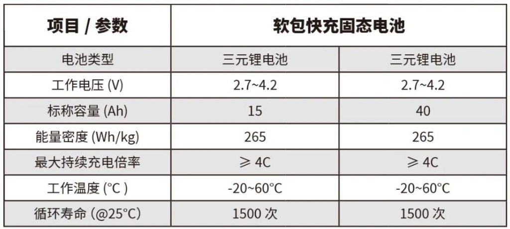 太藍新能源軟包超快充固態電池具備4C超快充能力,兩款快充固態電池標準容量分別為15Ah和40Ah,相對于其他固態電池來說容量較低,其能量密度為265Wh/kg,循環壽命達到1500次。