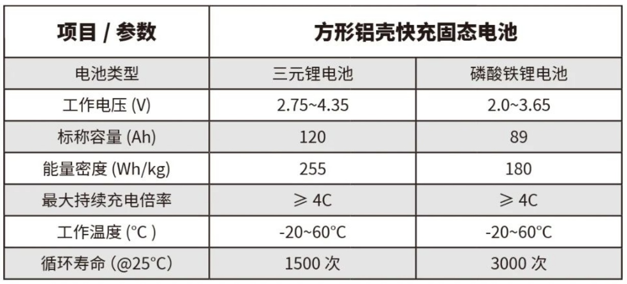 太藍新能源方形鋁殼超快充固態電池是業內研發出的第一款具備4C超快充能力的半固態方形鋁殼電池,分為三元鋰電池和磷酸鐵鋰電池兩種類型,其中三元鋰電池的容量及能量密度都要高于磷酸鐵鋰電池,但是磷酸鐵鋰電池的循環壽命卻高達3000次。