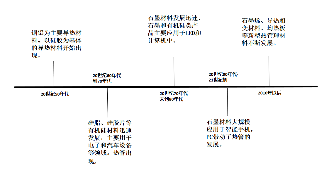 導(dǎo)熱材料的產(chǎn)業(yè)發(fā)展可以追溯到20世紀(jì)50年代,當(dāng)時(shí)的導(dǎo)熱材料以鋁和銅為主;20世紀(jì)60年代到70年代,有機(jī)硅材料開(kāi)始迅速發(fā)展,熱管出現(xiàn)。20世紀(jì)70年代至21世紀(jì)初,石墨材料迅速發(fā)展并得到了廣泛的應(yīng)用,此后,隨著5G、動(dòng)力電池等新型產(chǎn)業(yè)的發(fā)展,導(dǎo)熱需求激增,新型的熱管理材料不斷發(fā)展。
