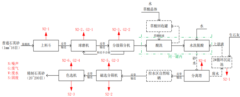 精制石英砂生產線工藝流程及產污環節圖