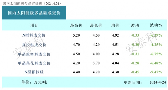 其中n型棒狀硅成交價格區間為4.50-5.20萬元/噸,成交均價為4.92萬元/噸,環比下跌6.29%。