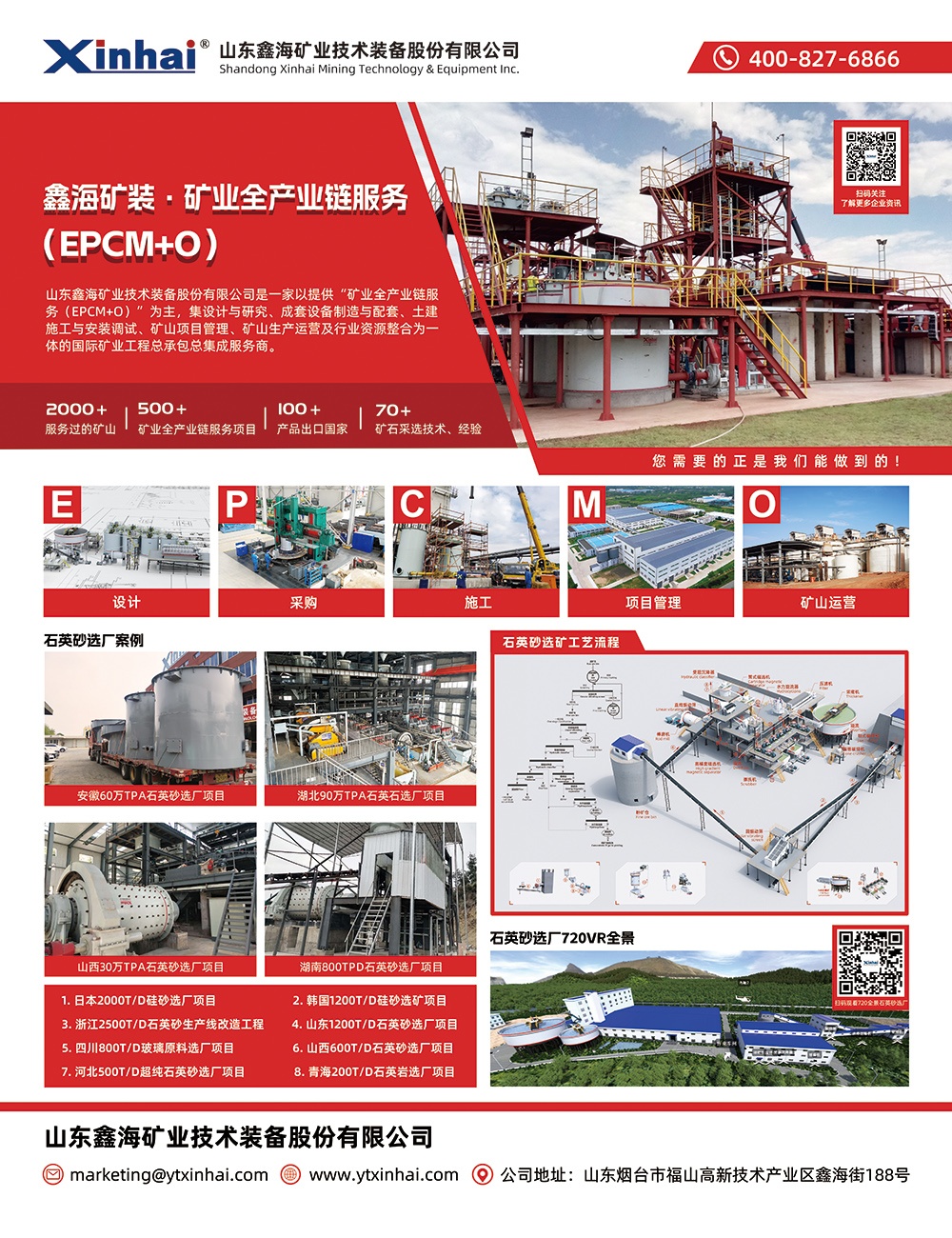 山東鑫海礦業技術裝備股份有限公司成立于1997年,前身為煙臺鑫海礦山機械有限公司,是一家以提供"礦業全產業鏈服務(EPC+M+O)"為主,集設計和研究 - 成套設備制造與采購 - 調試和交付 - 礦山管理 – 礦山運營和行業資源整合為一體的股份制高新技術企業。公司的業務范圍遍及世界各地,迄今已完成了2000 多座礦山設計和研究、設備供應項目,其中包含500 多個礦山EPC+M+O工程項目,具有70 余種礦石的采選技術和經驗,申請了多項專利,在多個國家設立了海外辦事處,產品出口100多個國家和地區。