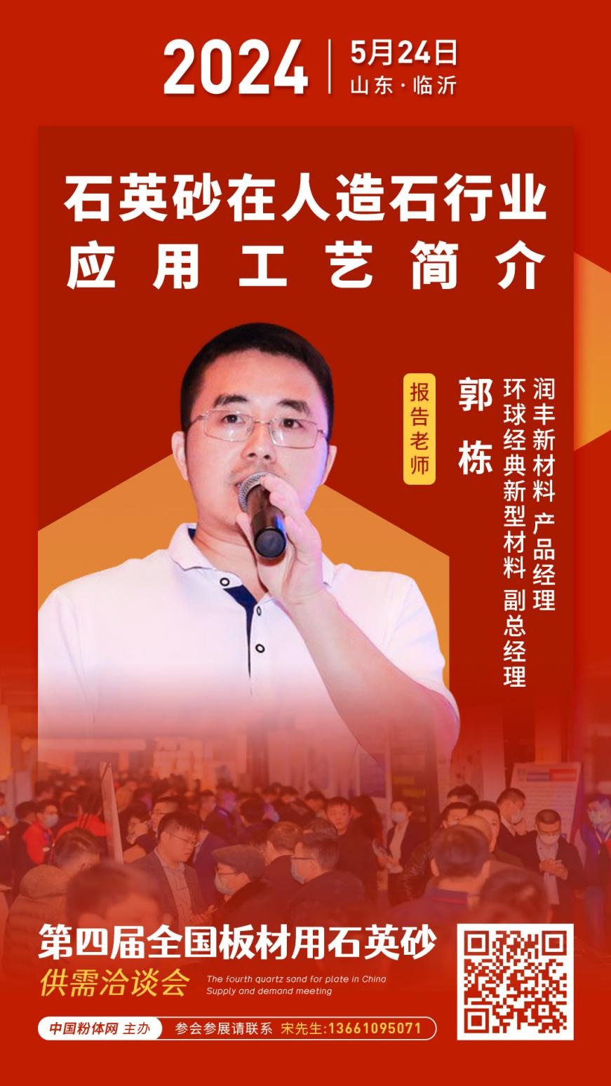2024年5月24日,由中國(guó)粉體網(wǎng)主辦的第四屆全國(guó)板材用石英砂供需洽談會(huì)即將在山東臨沂召開,東莞環(huán)球經(jīng)典新型材料有限公司副總經(jīng)理、潤(rùn)豐新材料產(chǎn)品經(jīng)理郭棟將做《石英砂在人造石行業(yè)應(yīng)用工藝簡(jiǎn)介》的報(bào)告,屆時(shí),他將對(duì)石英砂在人造石行業(yè)應(yīng)用工藝等問(wèn)題進(jìn)行詳細(xì)解讀。